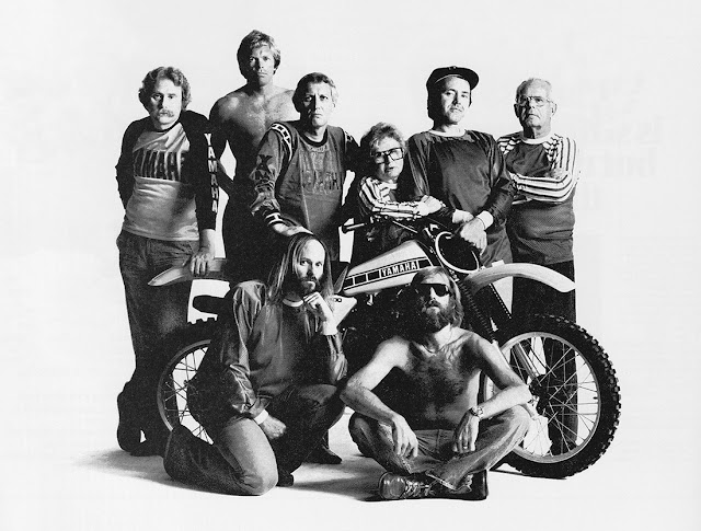 "What a treasure. I used to have a huge print of this photo. The guy behind Amy Miyano is none other than a mustacheo'd Brent Bouchez. The two cops are actually L.A. Police officers who were supervising a Yamaha shoot where we had to block L.A. traffic. It was taken against a graffiti covered wall. I think in the 6th Street tunnel downtown L.A. Tom Cordner is seated on the bike, I'm next to him and Brent Thomas is slightly behind me. What a classic." Photography by Mark Coppos. Mark Coppos does remember Bob Wheeler, the cop on the left. Mark also remarked: "I can't remember Amy being there. Maybe just to give us all a good natured hard time. But it seems she was always too busy for that."